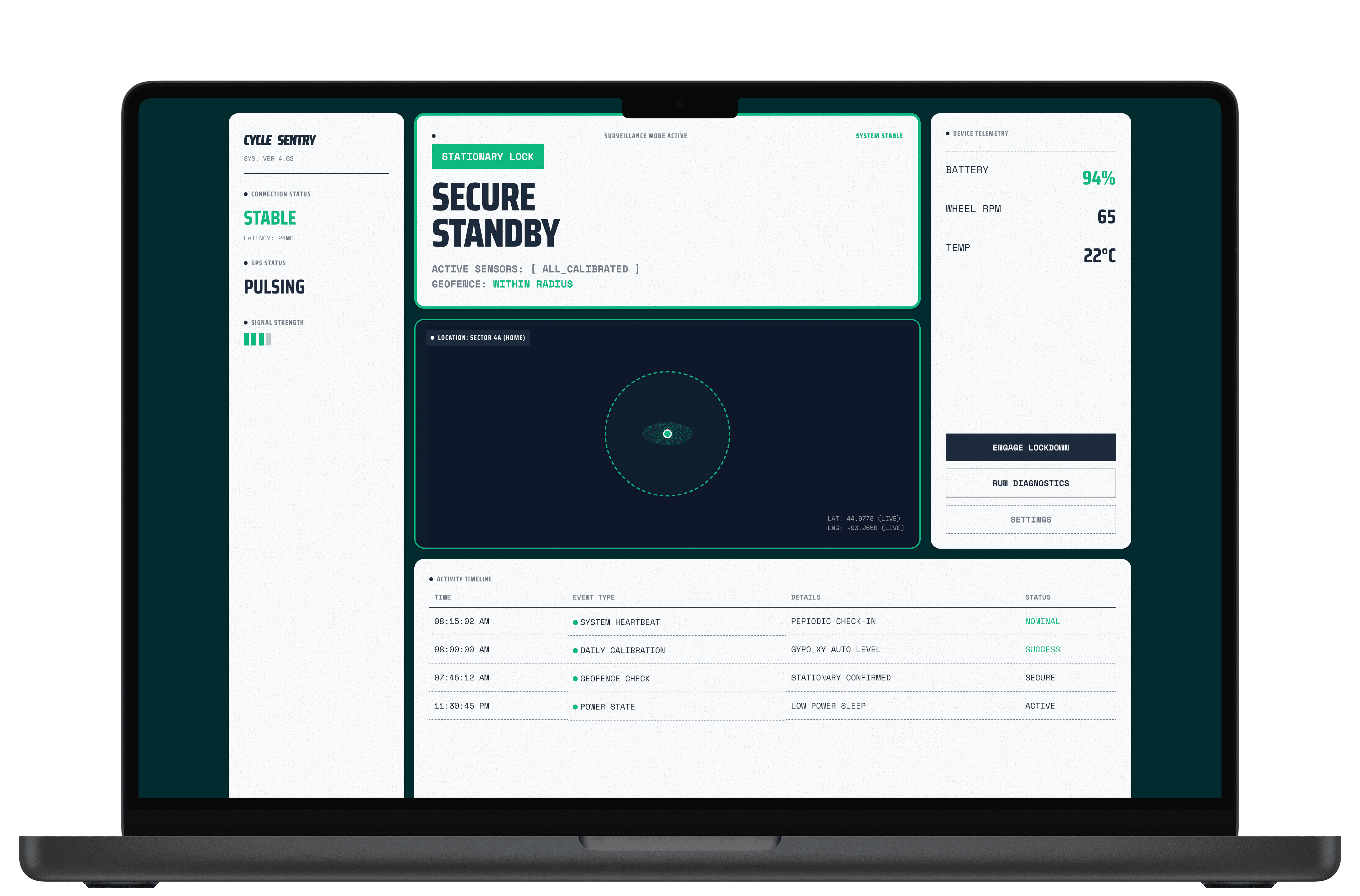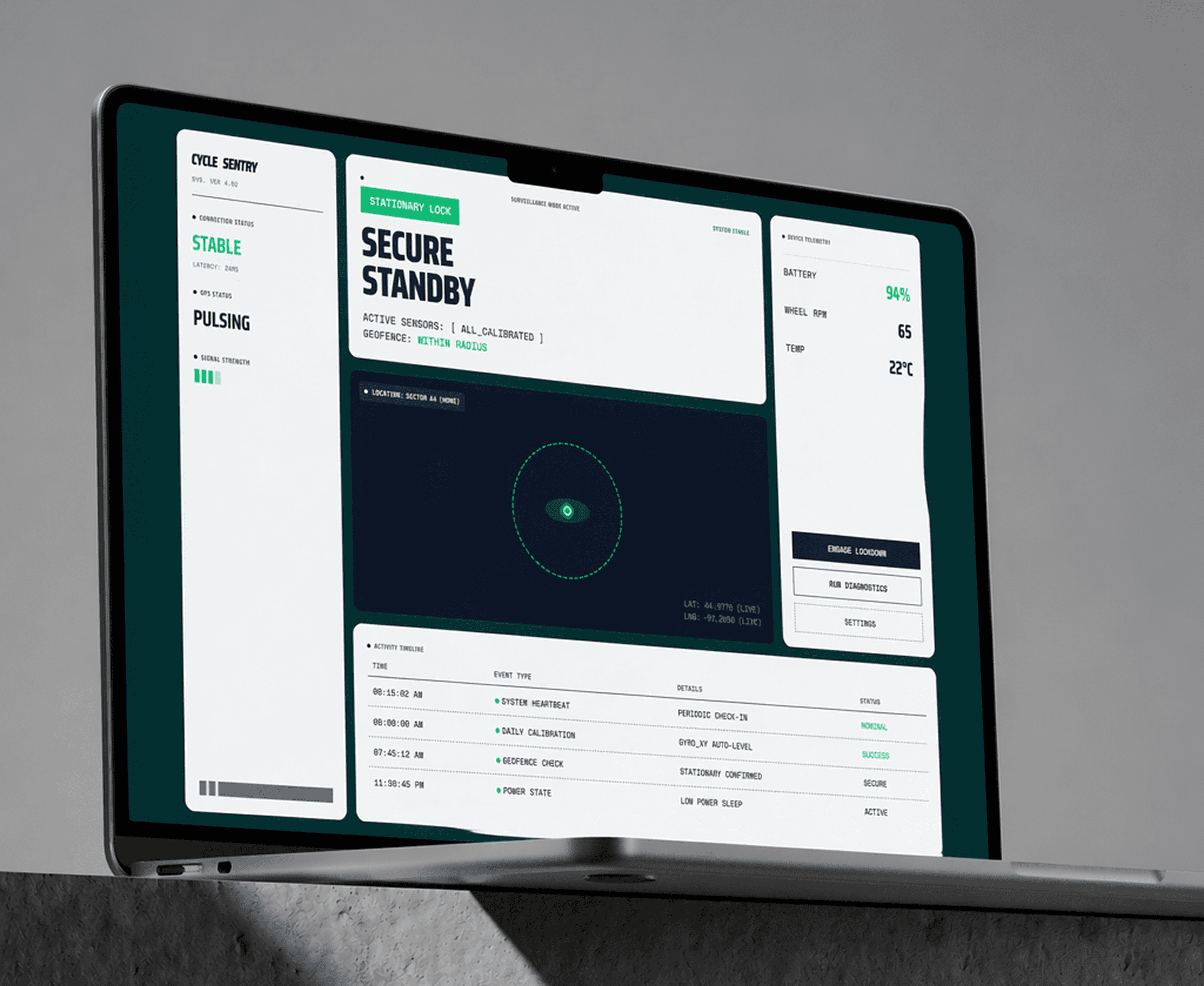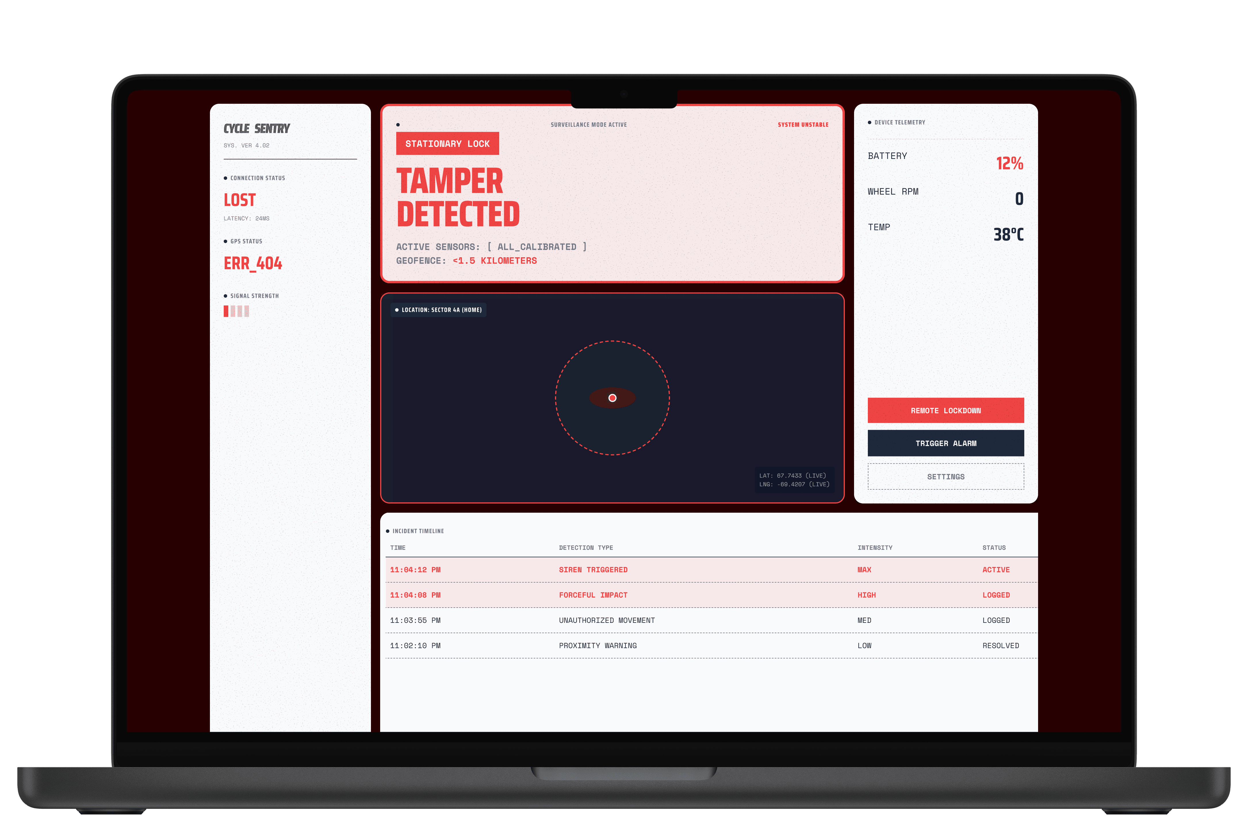 I designed Cycle Sentry, a monitoring dashboard for smart cycle security and usage tracking, inspired by frequent cycle thefts on campus. Under a focused one-week sprint, I developed a high-fidelity interface that combines real-time alerts, location tracking, and ride analytics—enabling users to both secure their cycles and monitor daily activity.